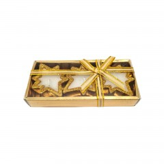 Adaugă o notă elegantă și festivă decorului tău de sărbători cu acest set rafinat de lumânări în formă de stea. Realizate în nuanțe de auriu și decorate cu sclipici, aceste lumânări aduc un plus de strălucire oricărei mese, ferestre sau aranjament de Crăciun.