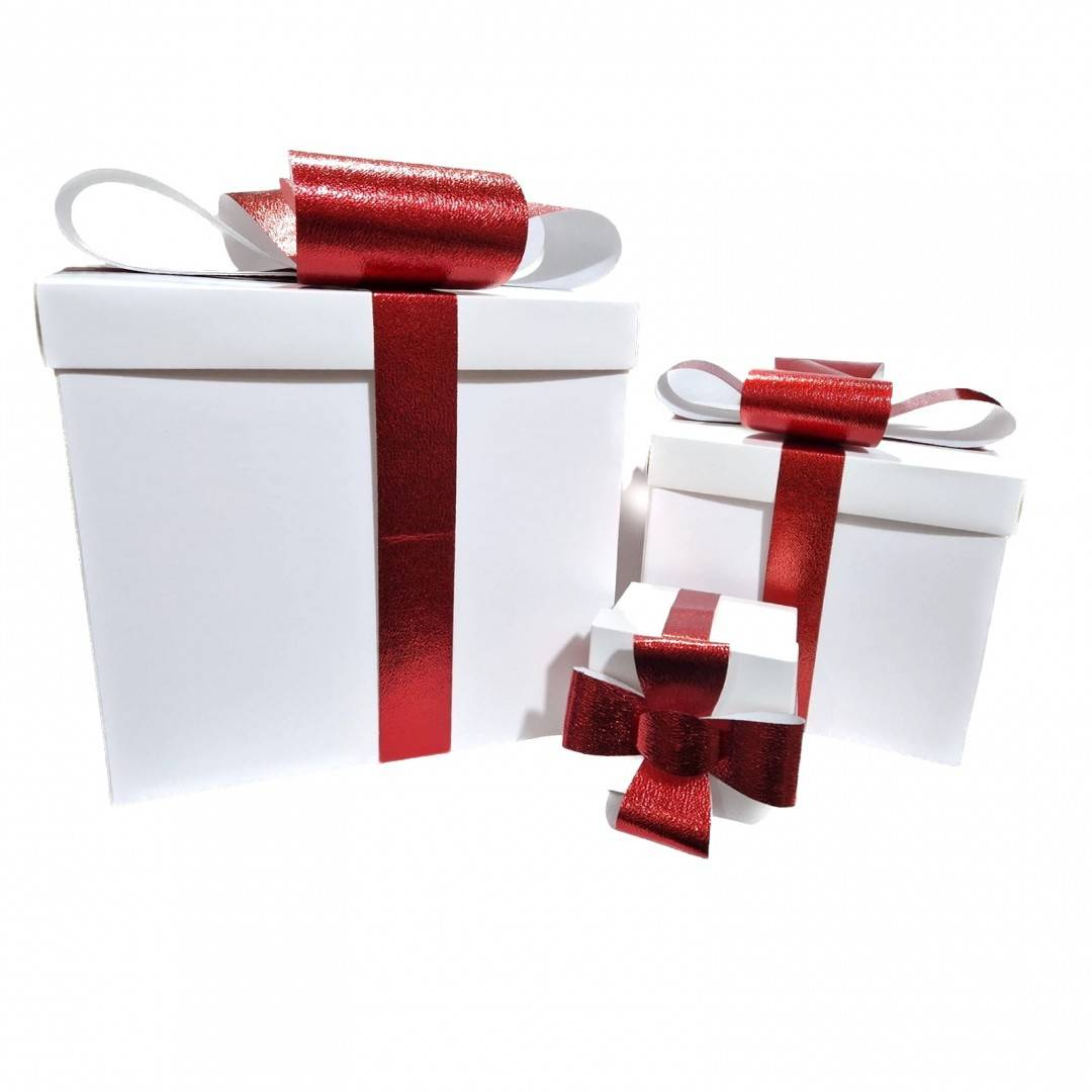 Cutia are forma unui cub cu latura de 30 cm. Este realizata din carton premium cu panglica din carton buretat.