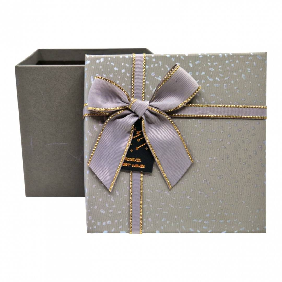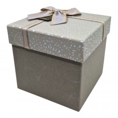 Cutia de cadou are latura de 13 cm si o inaltime de 12.5 cm. Pe capac are fixata o fundita eleganta din material textil.
