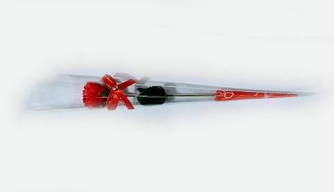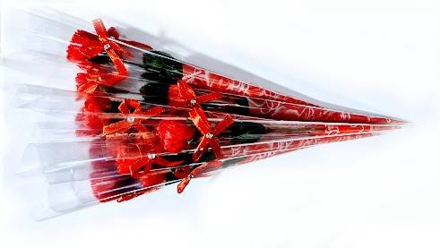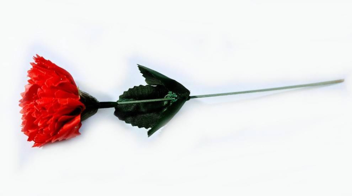 Garoafa are petalele realizate din foita de sapun, tija este din plastic iar frunzele sunt textile. Este ambalata in folie transparenta in forma de con.