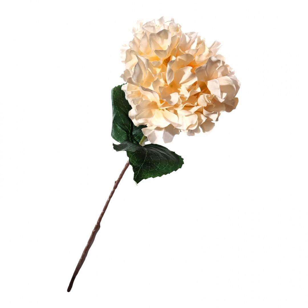 Firul de hortensie este inalt, maiestuos, cu frunze mari, frumos pigmentate si petale delicate. Tulpina este groasa, dreapta, sustine cu fermitate floarea in orice pozitie este asezata. Poate fi usor curbata. Frunzele sunt realizate din material textil frumos pigmentat in nuante naturale de verde, floarea este din material textil.