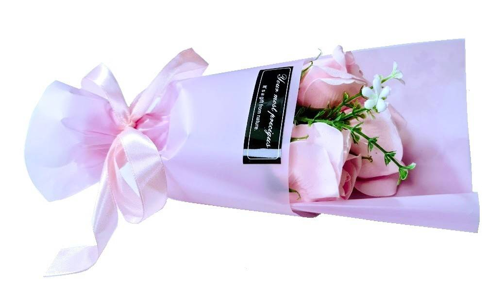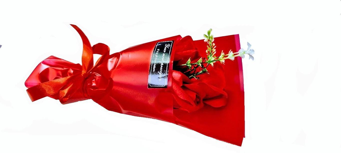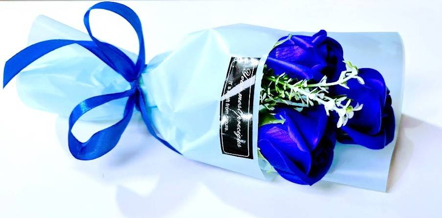 Buchetul elegant compus din 3 flori de sapun este ambalat estetic. Buchetul este asezat in cutie transparenta . Florile de sapun sunt un decor deosebit in casa, de lunga durata, o pata de culoare, o amintire placuta.