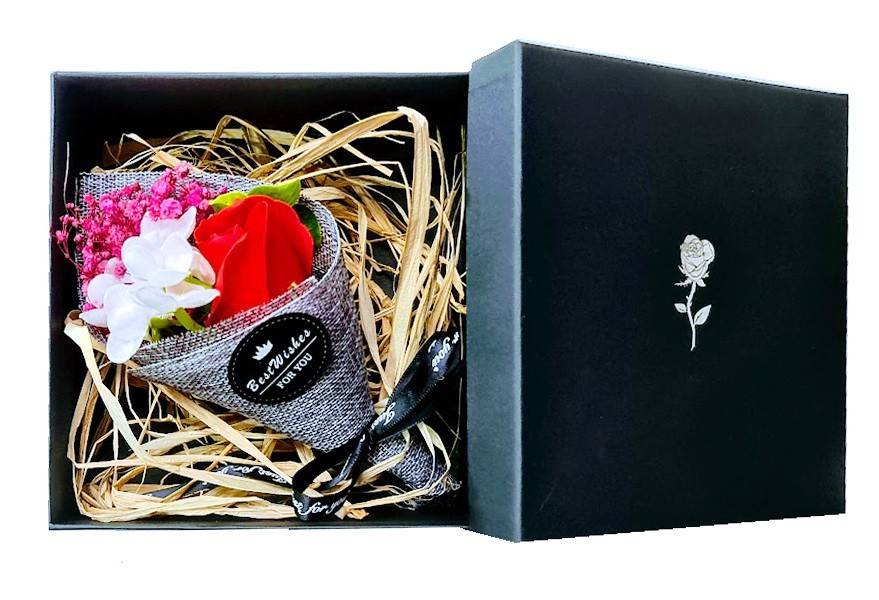 buchet flori de sapun ambalat in cutie cadou