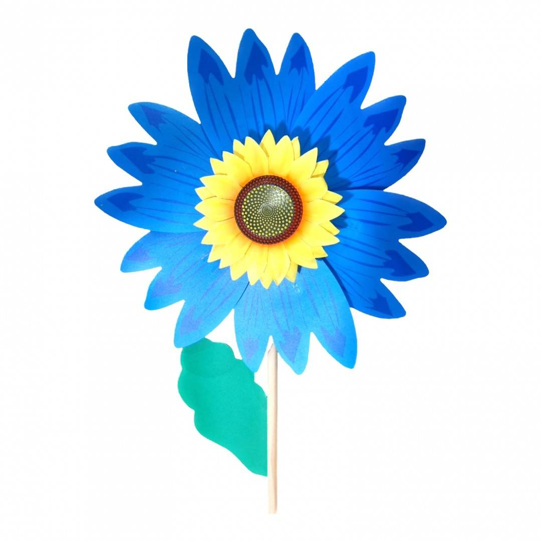Morisca de vant are 6 palete si o floare cu petale textile in centru. Paletele sunt realizate din folie de plastic si sunt prinse pe un bat din lemn. Frunza este deasemenea din plastic