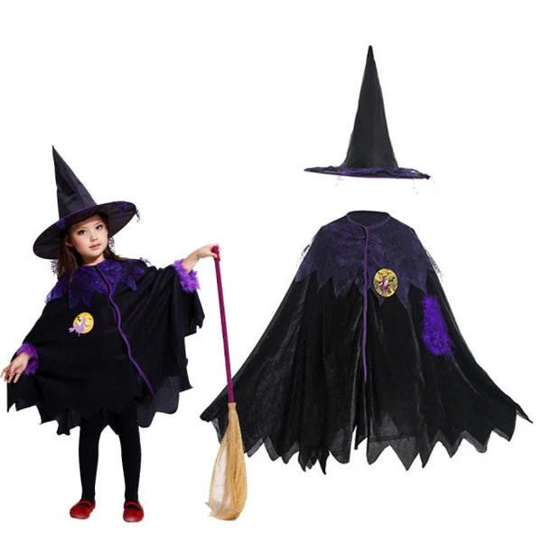 Setul conține o pelerină neagră cu accente mov și un emblemă decorativă cu tematică de Halloween, alături de o pălărie conică asortată. Pelerina are tiv zimțat pentru un efect misterios, iar materialul ușor o face confortabilă și ușor de purtat peste orice ținută.