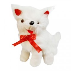 Catelul este realizat din material textil alb, cu ochisori sticlosi si nas proeminent din plastic. Cand este mangaiat,latra si i se aprind ochisorii.