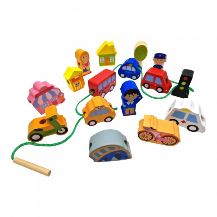 Conținut: piese tematice cu vehicule, clădiri, personaje și semne de circulație + șnur pentru înșirat.