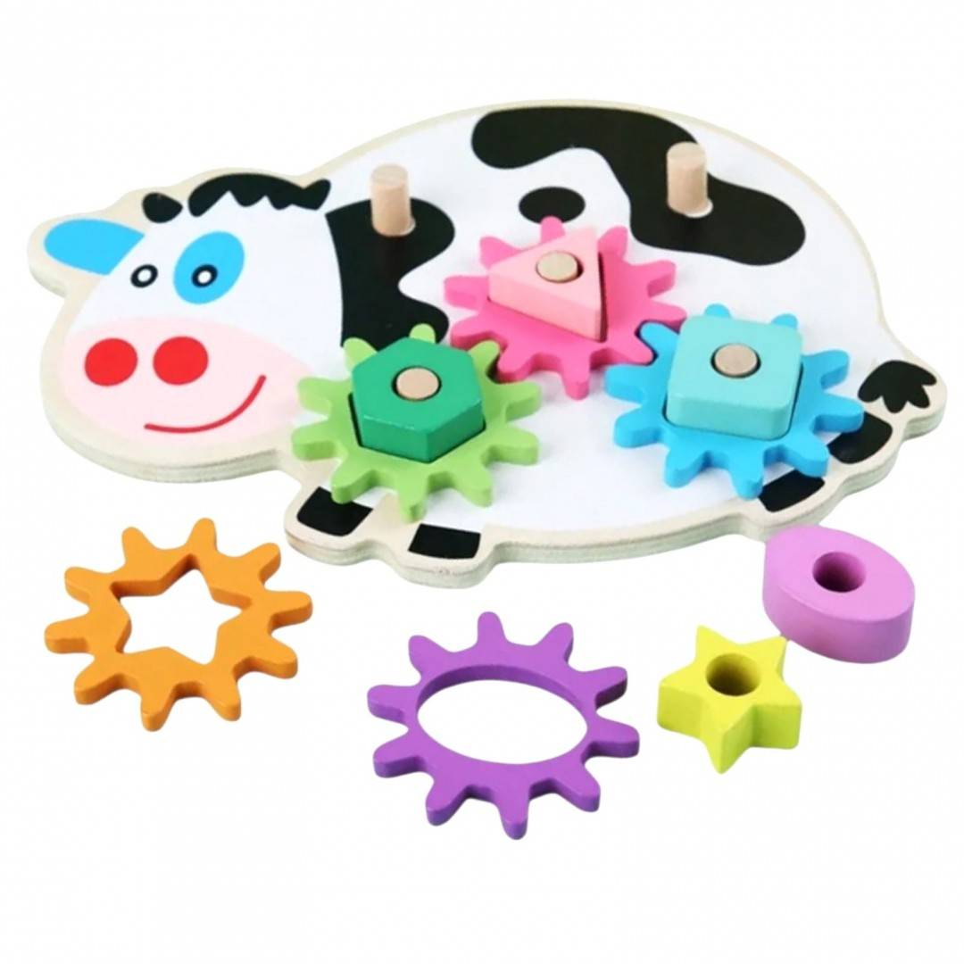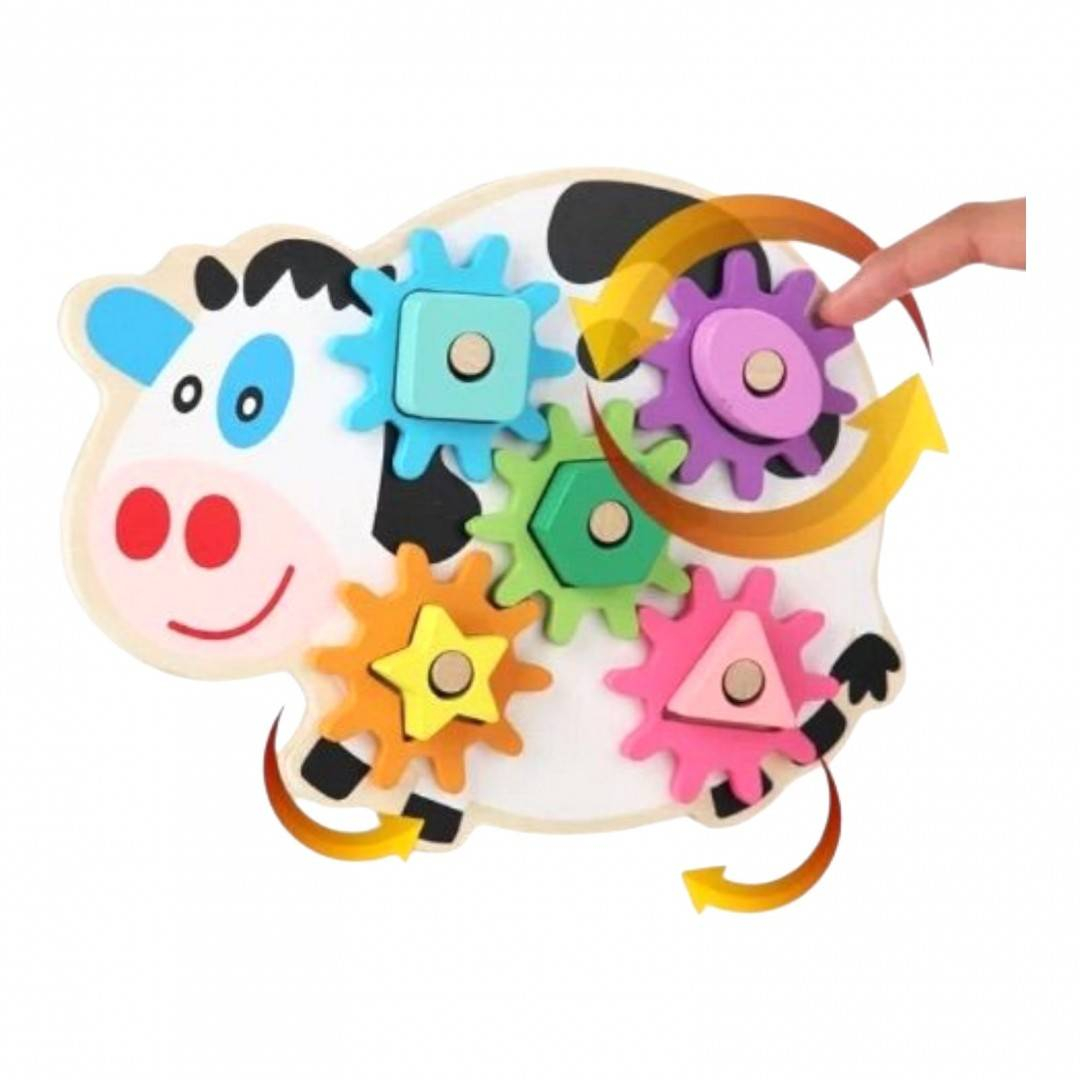 Jucarie educativa din lemn, vacuta cu roti dintate colorate