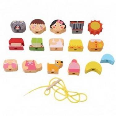 Setul cuprinde 16 piese din lemn cu diferite imagini si un snur cu un capat din lemn. Copiii pot invata denumirea hainutelor, pot asocia hainutele potrivite fetitei sau cele potrivite baietelului,pot invata culorile, pot numara piesele insirate sau pot realiza diferite jocuri de rol cu ajutorul mingiutei si a catelului.
