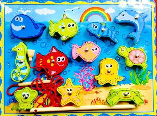 3.Joc de pescuit. Setul contine o undita din lemn cu capat magnetic, creaturile marine au magneți mici, care, fără îndoială, fac jocul mai distractiv și îmbunătățește capturarea.