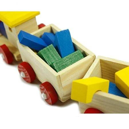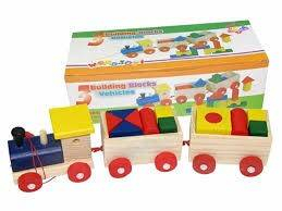 Setul contine: locomotiva , doua vagoane , 19-20 piese din lemn de diverse forme geometrice pentru construit