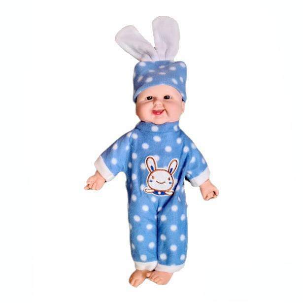 papusa interactiva, bebe care rade, corp moale, caciula cu urechi de iepure, 36 cm