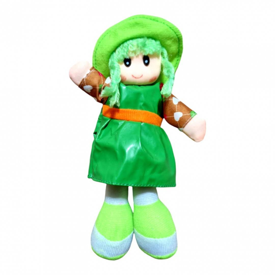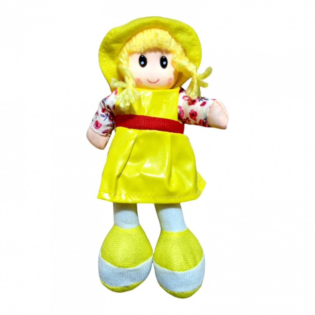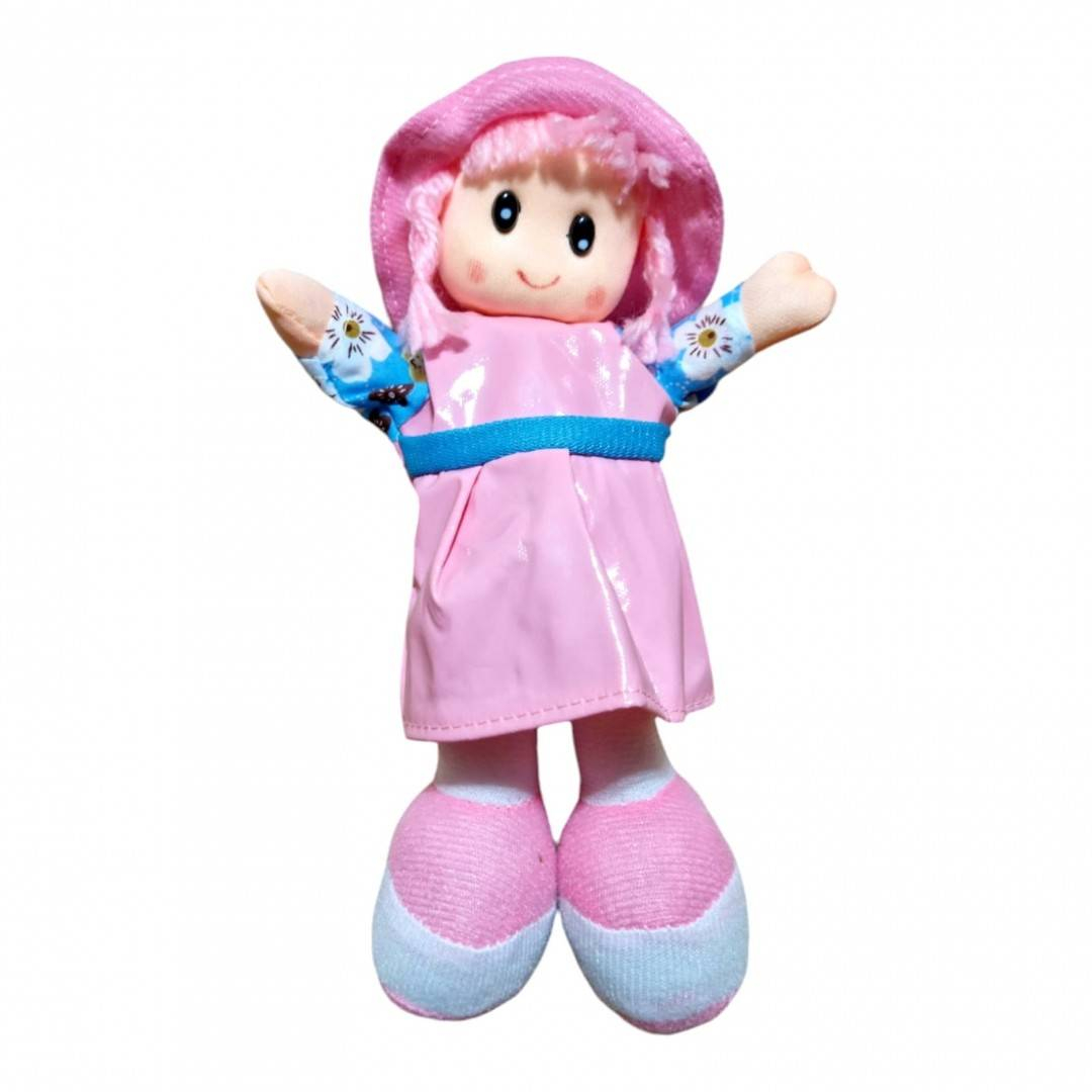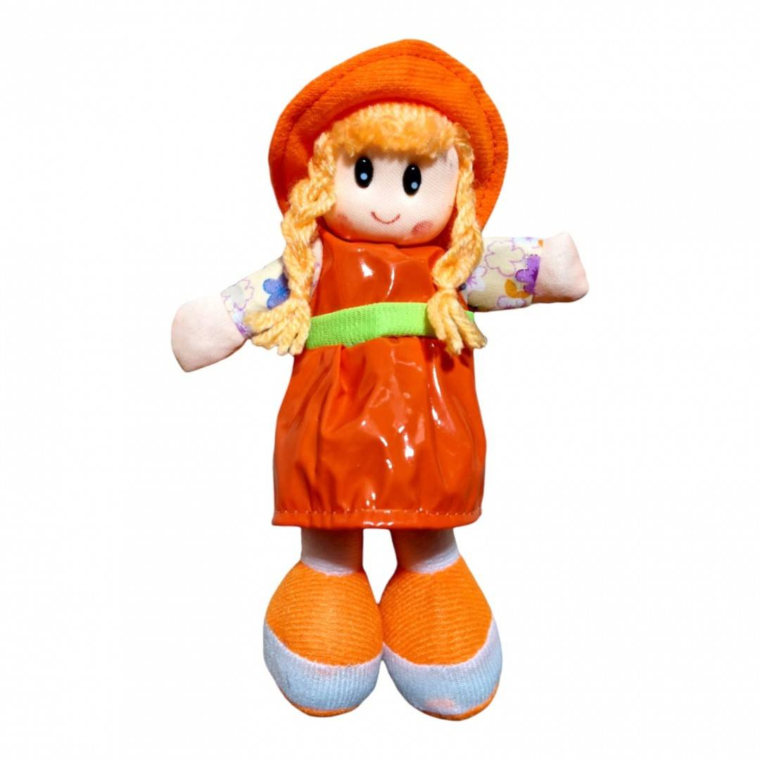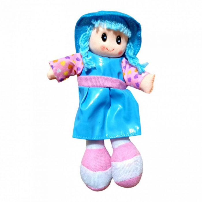 Papusica este confectionata din material textil, este foarte moale, ochisorii sunt realizati din plastic. Parul este din fire textile impletite.