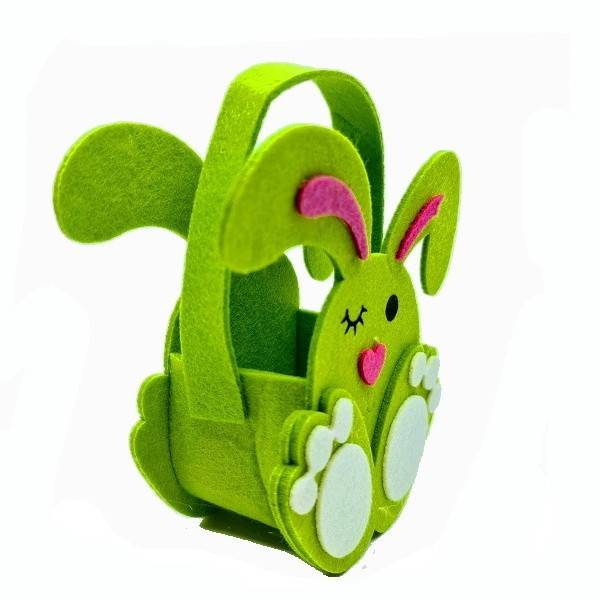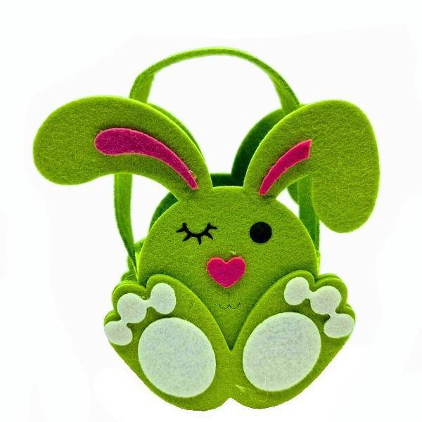 Geanta este relizata din fetru de culoare verde, decupata in forma de iepure. Labutele , nasul si interiorul urechiuselor sunt realizate din fetru aplicat. Ochisorul inchis strengareste, precum si nasucul sub forma de inimioara, face ca gentuta sa fie indragita de toti prichindeii. Este suficient de incapatoare, poate fi umpluta cu un ou, o mica surpriza si un pic de dulce, bineinteles