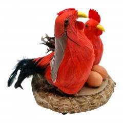 Cuibul este realizat din fire naturale, pasarile sunt din polistiren placat cu pene naturale iar cele doua oua din cuib sunt din plastic.