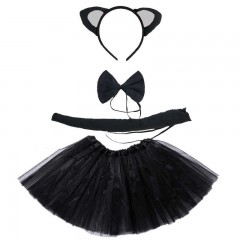 Papionul, urechiusele si codita sunt realizate din material textil usor plusat care imita blanita scurta de pisica. Papionul si codita sunt prevazute cu un elastic negru de prindere. Bentita este realizata din plastic imbracat cu un material subtire de culoare neagra, cele doua urechiuse au intaritura si sunt realizate in doua culori: negru/argintiu. Fustita este realizata din doua randuri de tul, este transparenta, are o lungime de 30 cm, are elastic in talie.