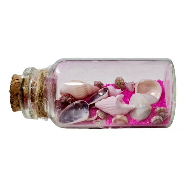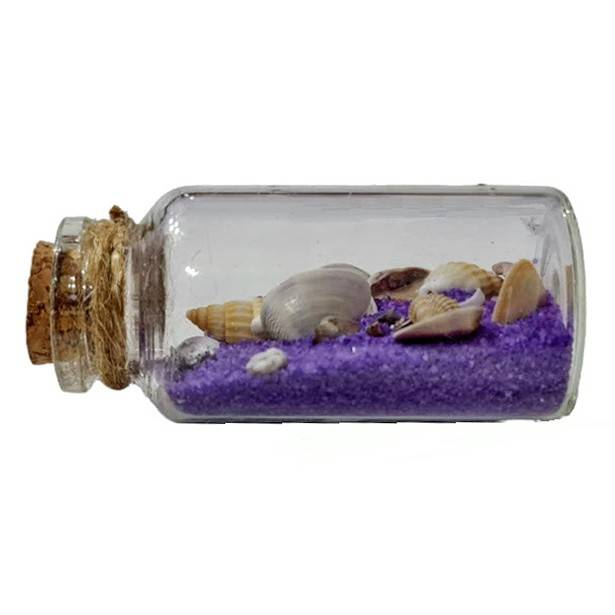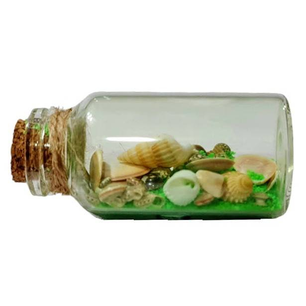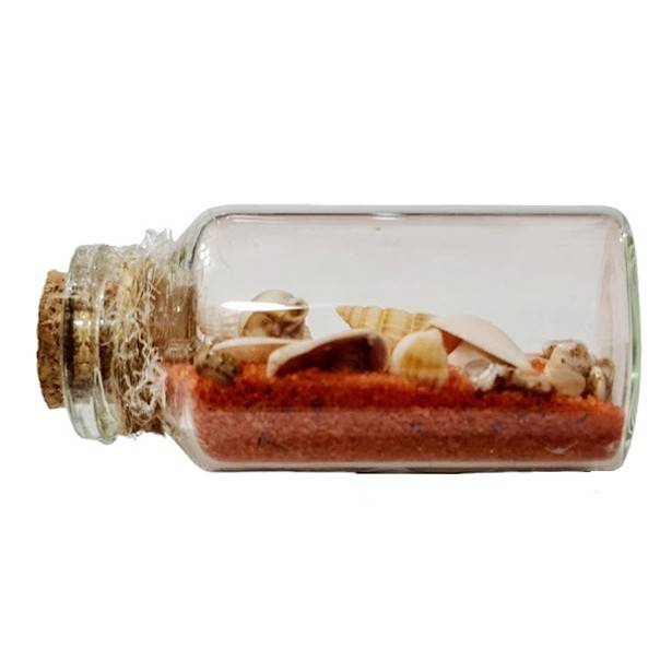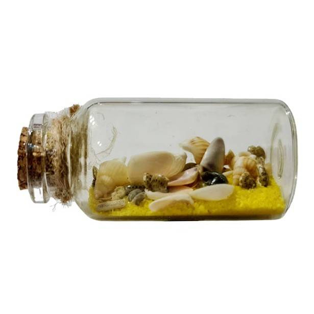 Sticla are mai multe tipuri de melci si scoici amestecate in nisip colorat. Scoicile, dopul de pluta, sfoara de yuta, toate sunt naturale si armonios combinate.