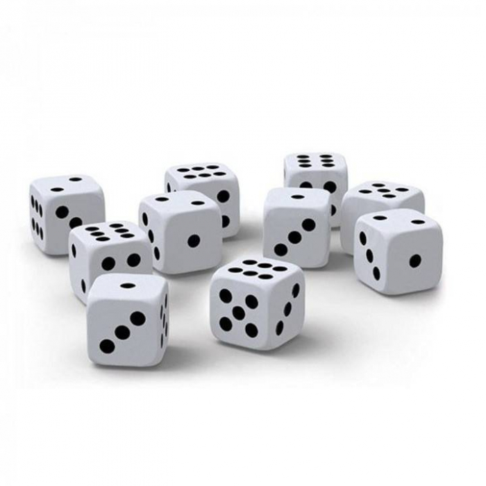 Setul contine 100 zaruri din plastic, albe cu buline negre