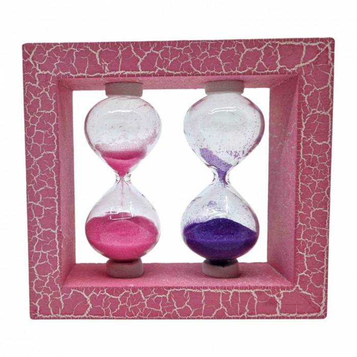 Cele doua clepsidre sunt realizate din sticla si sunt fixate pe un cadru din plastic cu efect marmorat.