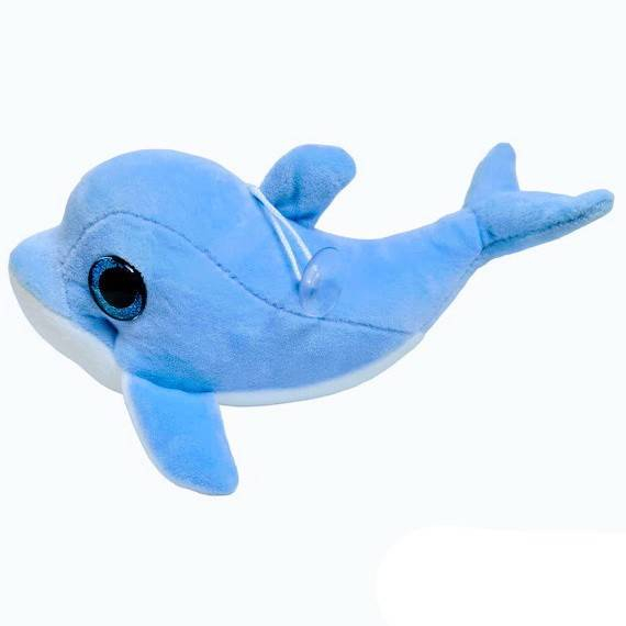Delfinul din plus este usor catifelat, are ochisori din plastic cu efect sticlos si foarte expresivi. Are un snur cu ventuza pentru a fi lipit pe suprafete netede.