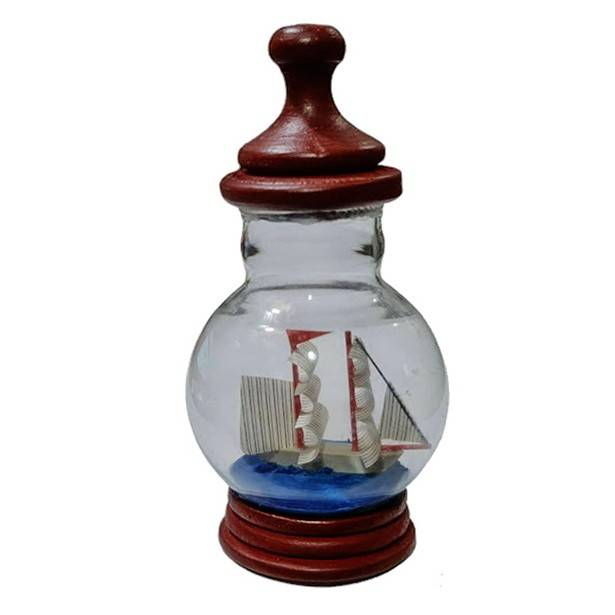 Corabia in miniatura este realizata din lemn, fiecare piesa este fixata manual, cu o penseta specifica, in interiorul sticlutei. Datorita bazei de lut albastru, corabia pare ca pluteste pe apa.