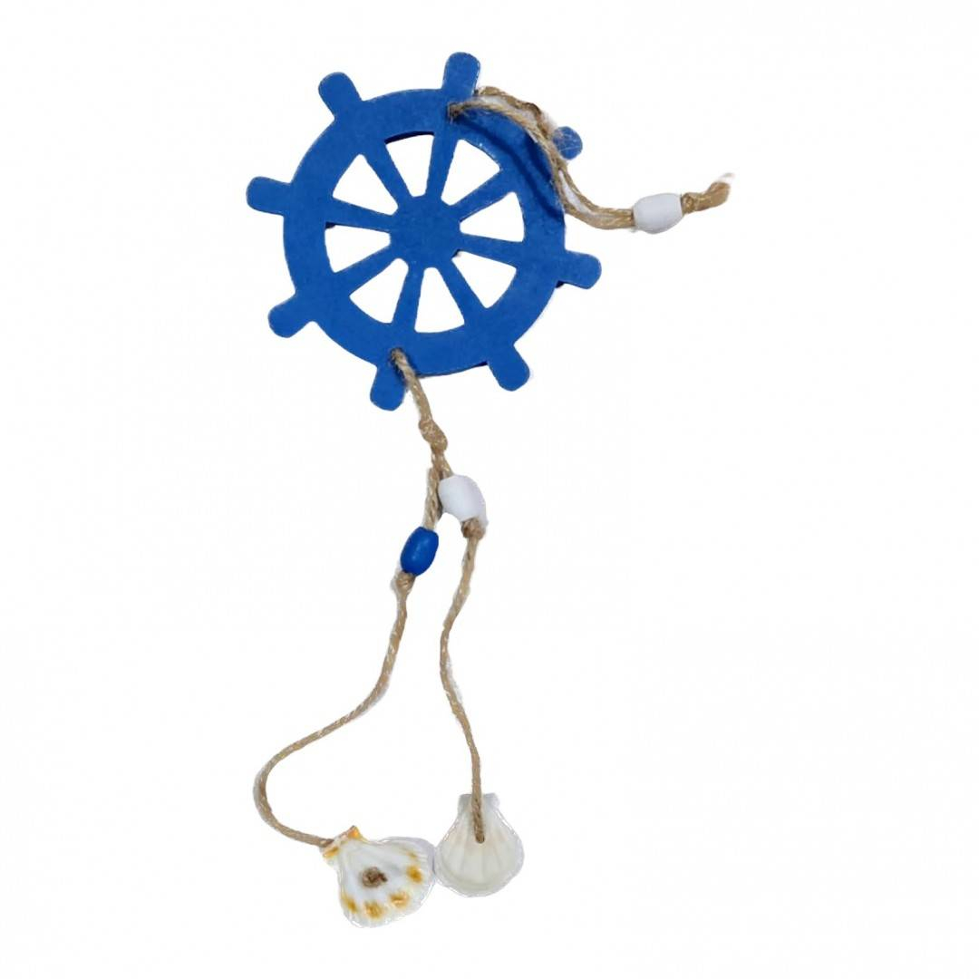 Timona este realizata din lemn, are o sfoara cu inel din lemn pentru a putea fi agatata iar la partea inferioara are suspendate, la distante diferite, doua scoici naturale. Decoratiunea este atent finisata iar combinatia dintre sfoara de yuta si lemnul vopsit in culori marine ne trimite catre natura, catre suierul marii involburate.
