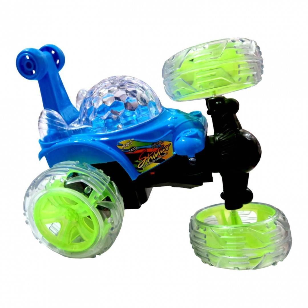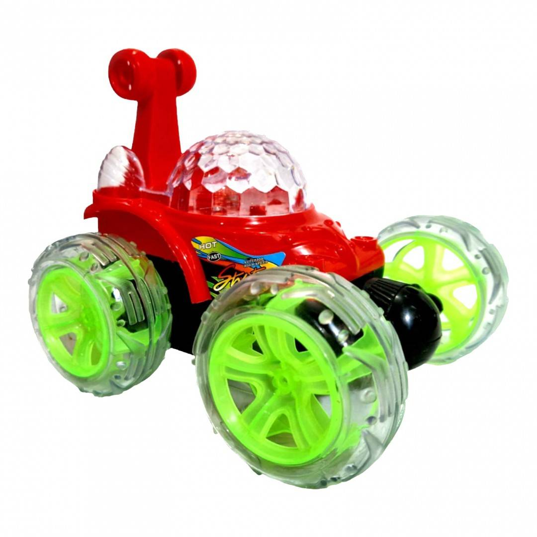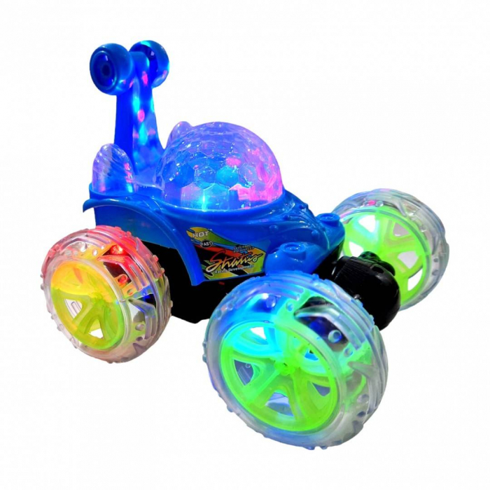Masina poate fi controlata din radio comanda, se roteste in toate directiile, se intoarce 360 grade, se roteste in spirala, se da peste cap. Fiind o masina cu garda inalta, poate fi folosita fara probleme atat in interior cat si in exterior. Masina este protejata de rotile mari de silicon, in momentul impactului cu un obiect nedorit, aceasta nu numai ca rezista dar ofera un adevarat spectacol, se da peste cap, se roteste, isi schimba cu usurinta directia de mers. Prin cuplarea butonului on/off toate partile transparente ale masinii sunt invadate de lumini multicolore. Se aprind, se sting, isi schimba culoarea, totul in ritmul muzicii. Se incarca direct prin cuplarea la priza, nu este necesara scoaterea acumulatorului pentru incarcare. Radio comanda functioneaza cu 2 baterii de 1.5V AA, neincluse in set. Pentru o mai buna siguranta, radio comanda are antena cablata.