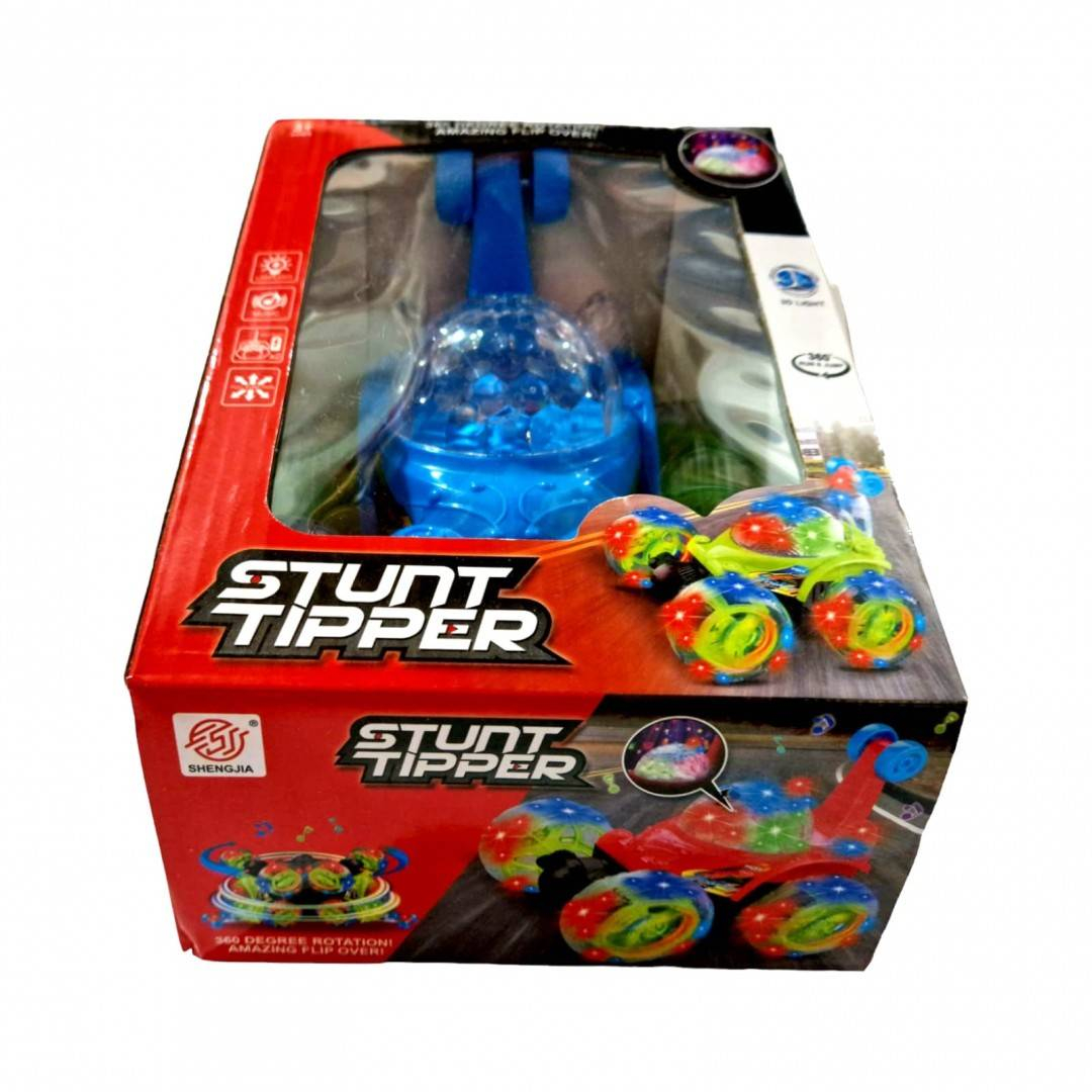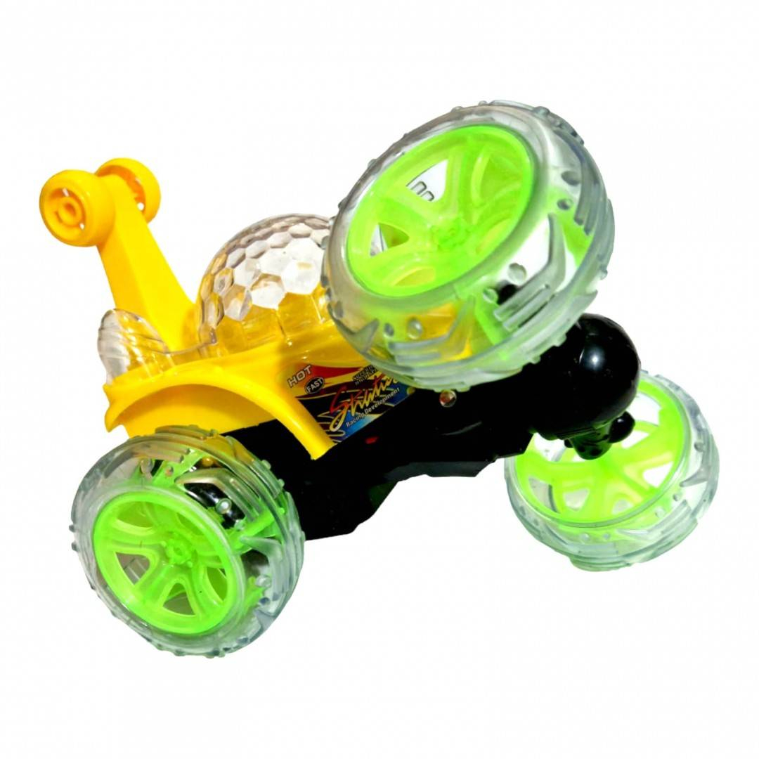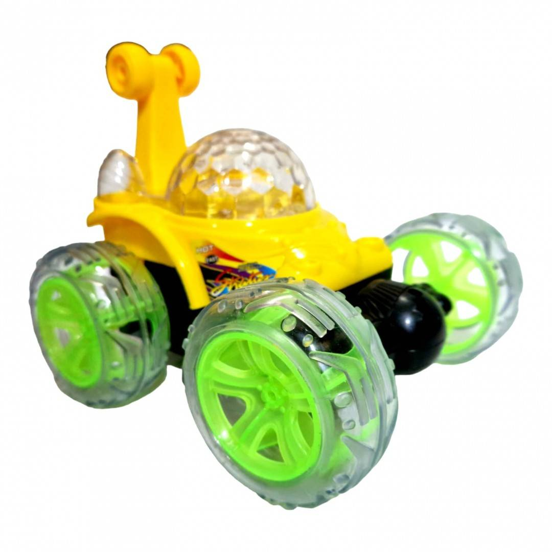 Masina poate fi controlata din radio comanda, se roteste in toate directiile, se intoarce 360 grade, se roteste in spirala, se da peste cap. Fiind o masina cu garda inalta, poate fi folosita fara probleme atat in interior cat si in exterior. Masina este protejata de rotile mari de silicon, in momentul impactului cu un obiect nedorit, aceasta nu numai ca rezista dar ofera un adevarat spectacol, se da peste cap, se roteste, isi schimba cu usurinta directia de mers. Prin cuplarea butonului on/off toate partile transparente ale masinii sunt invadate de lumini multicolore. Se aprind, se sting, isi schimba culoarea, totul in ritmul muzicii. Se incarca direct prin cuplarea la priza, nu este necesara scoaterea acumulatorului pentru incarcare. Radio comanda functioneaza cu 2 baterii de 1.5V AA, neincluse in set. Pentru o mai buna siguranta, radio comanda are antena cablata.