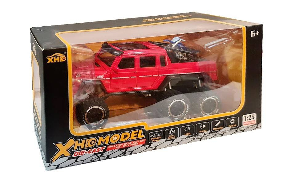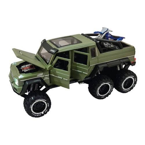 masina metalica cu amortizoare si roti din cauciuc, macheta cu usi care se deschid, lumini și sunete, motocicleta, 1:24, SUV rosu/negru/verde