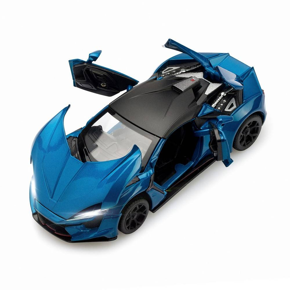 Masina metalica sport, macheta cu portiere care se deschid, pull back, lumini si sunete,baterii incluse,1:32, albastru/rosu